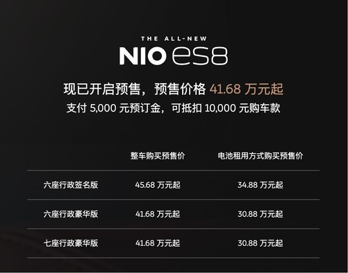 价格往往是消费者购车时最为关注的因素之一。全新ES8预售价41.68万元起(整车购买),电池租用方式30.88万元起,相比老款降价11万元,这样的价格在高端纯电SUV市场确实具有一定的竞争力。